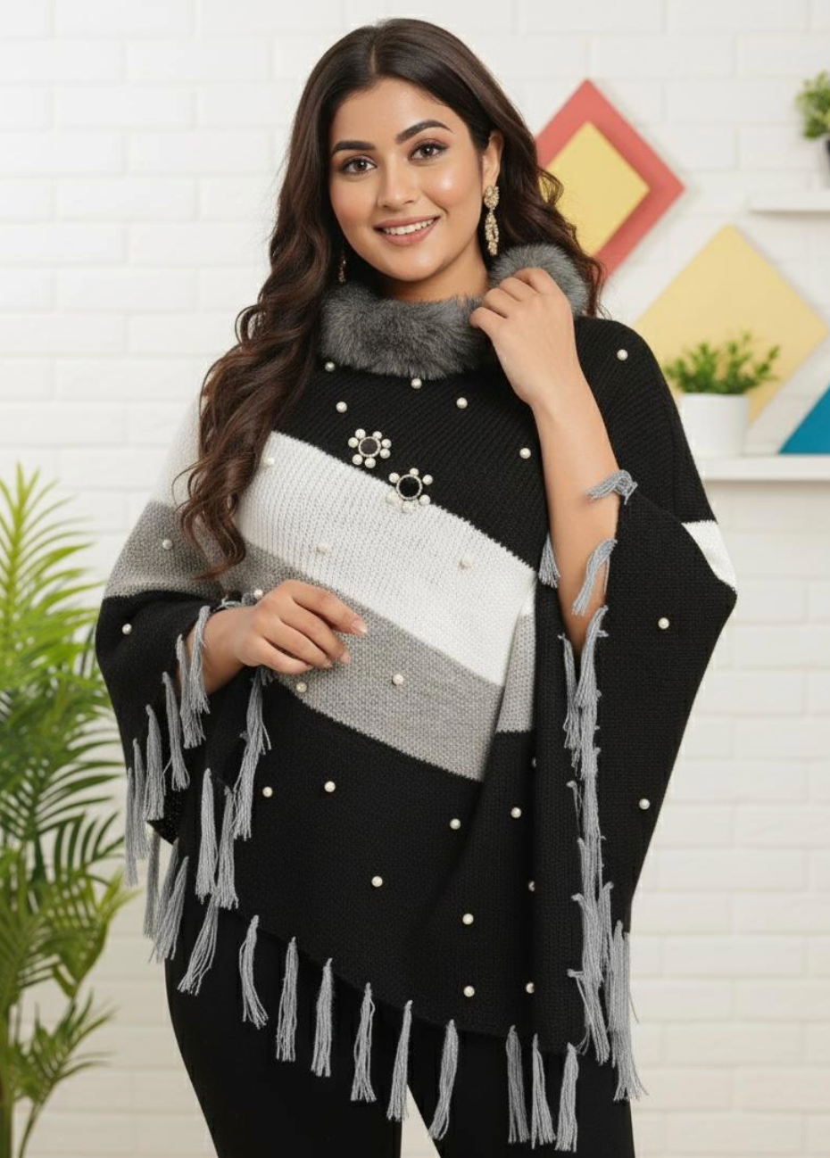 Discover the perfect blend of comfort and chic with our elegant poncho and stylish ribbed pieces.